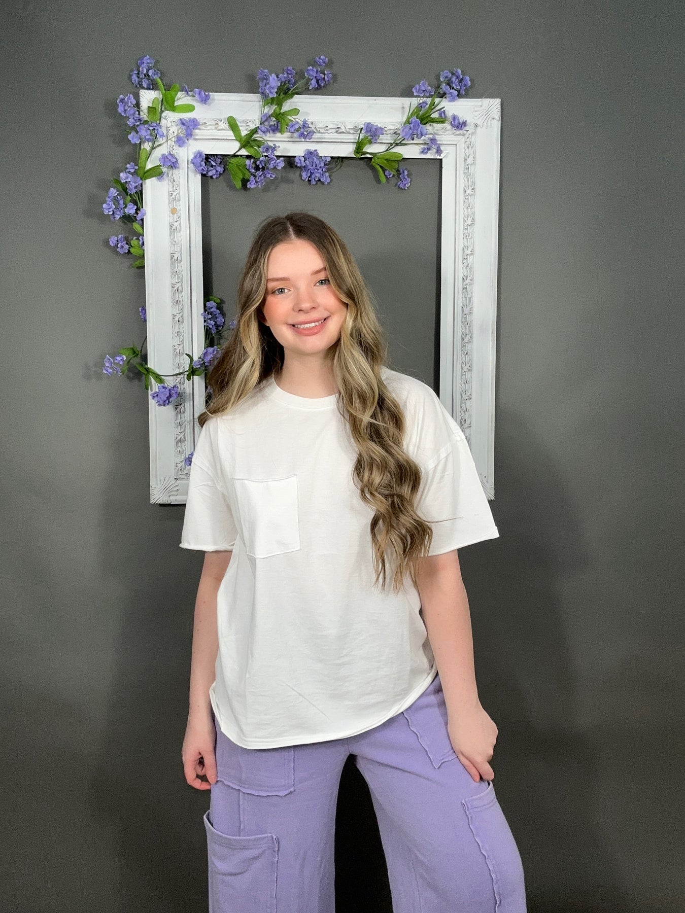 Clean, classic, and easy to wear. The Emily White Pocket Tee is the kind of everyday staple that goes with everything. It’s simple, flattering, and perfect for those “what do I wear today?” moments—pair it with denim, shorts, or layer it under a jacket and you’re set.