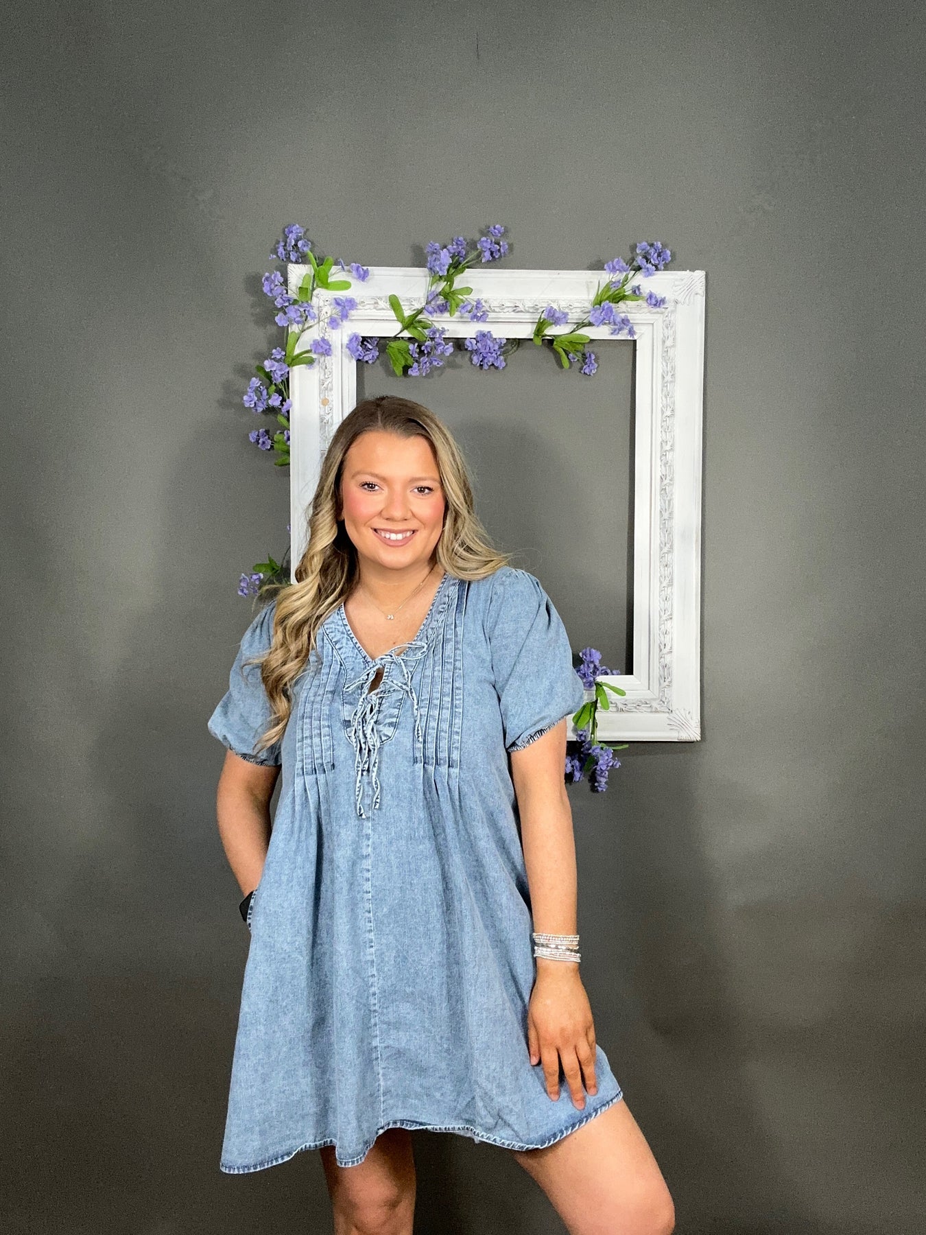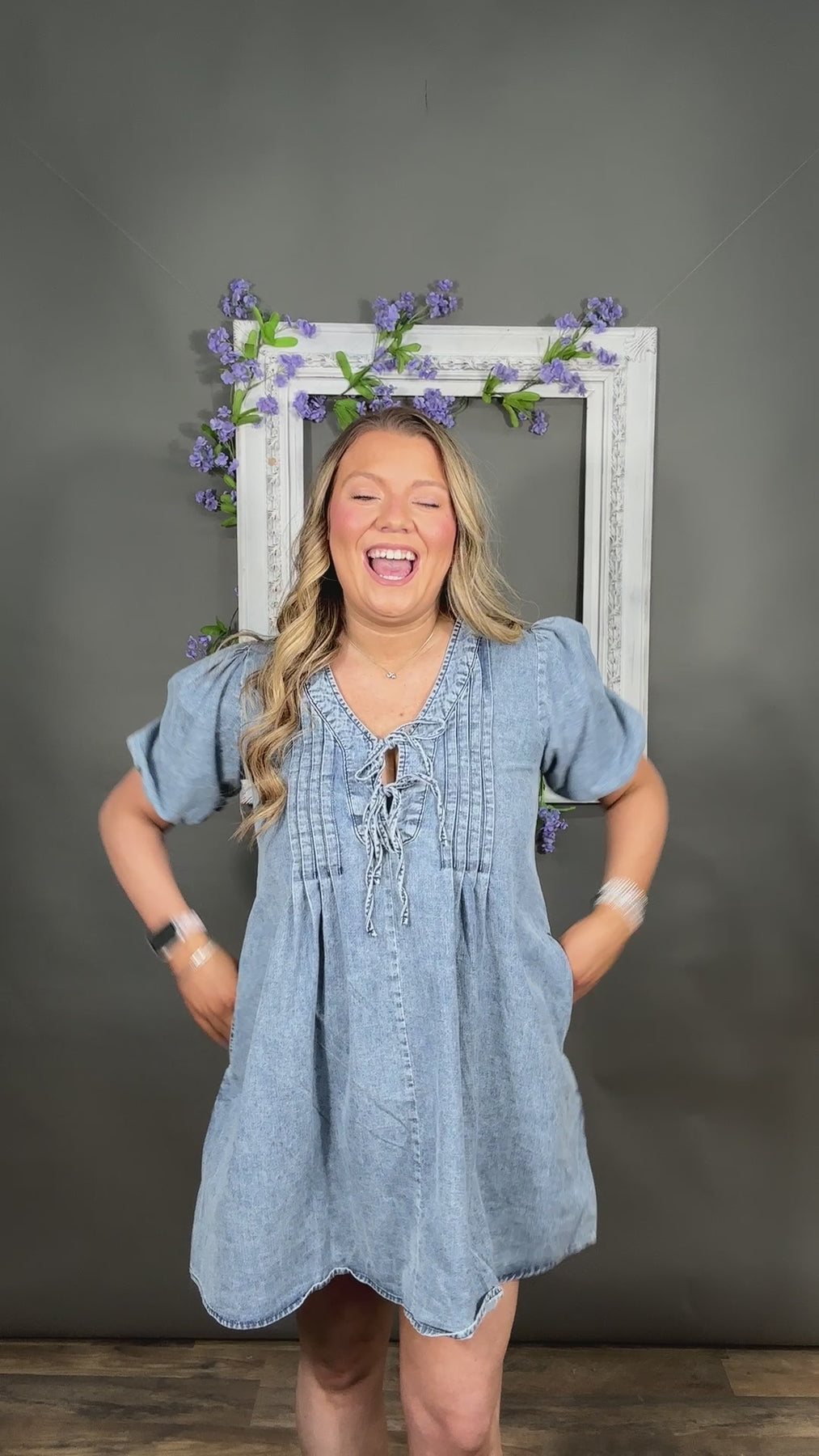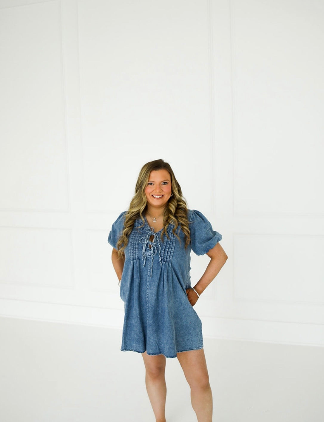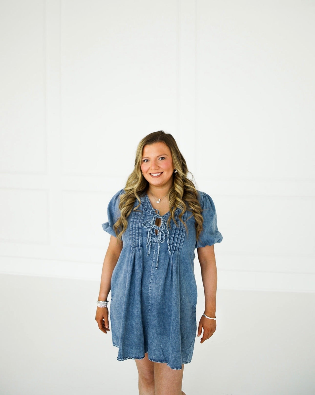Woman wearing blue denim dress with puffy sleeves, lace-up neckline, and embroidered details, smiling with hand on hip