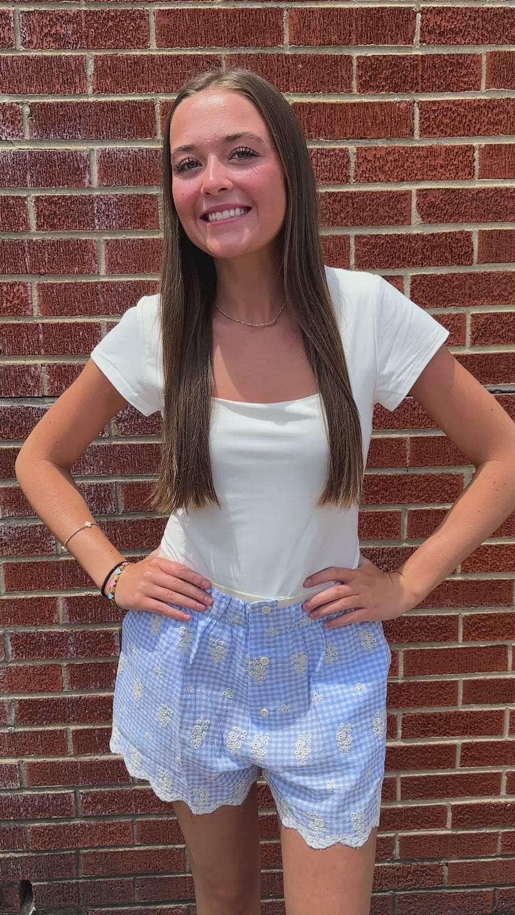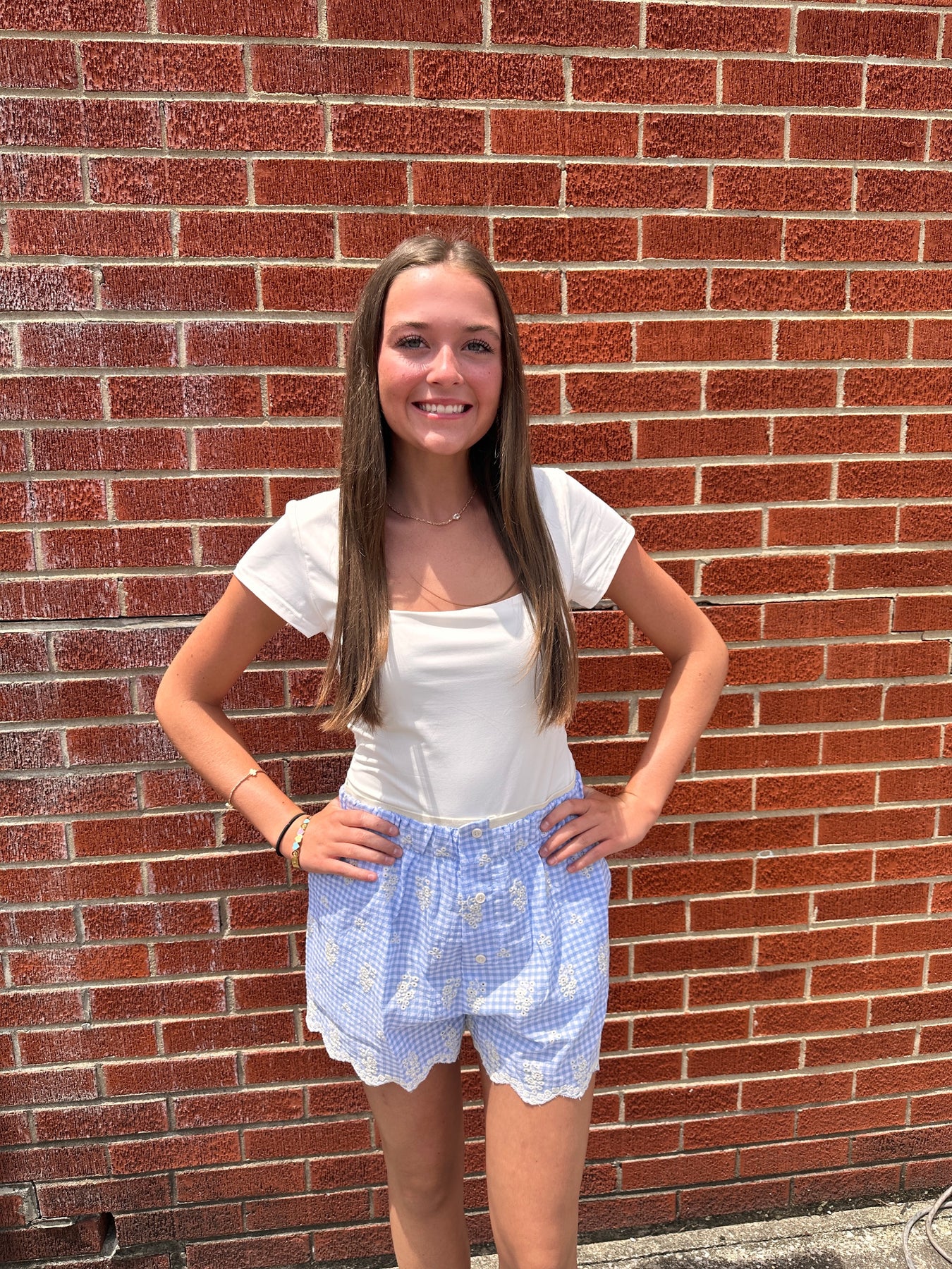 Experience comfort and style with the Rebecca Embroidered Cotton Shorts. Featuring a classic blue gingham pattern, these boxers combine breathable cotton fabric with delicate embroidery for a refined look. Perfect for lounging or casual wear, they offer a lightweight feel that keeps you cool and comfortable all day. Elevate your wardrobe with these charming, versatile shorts.