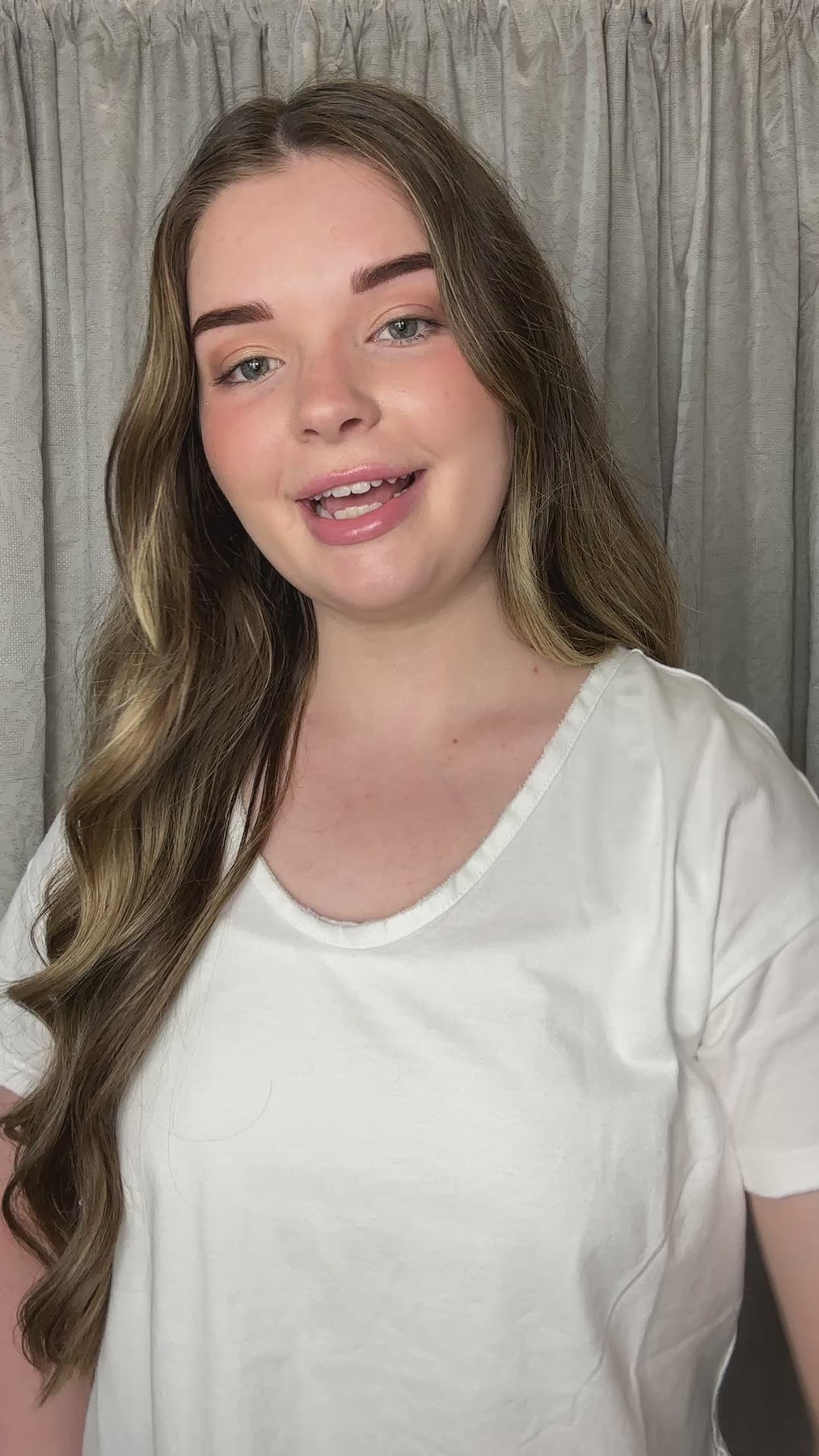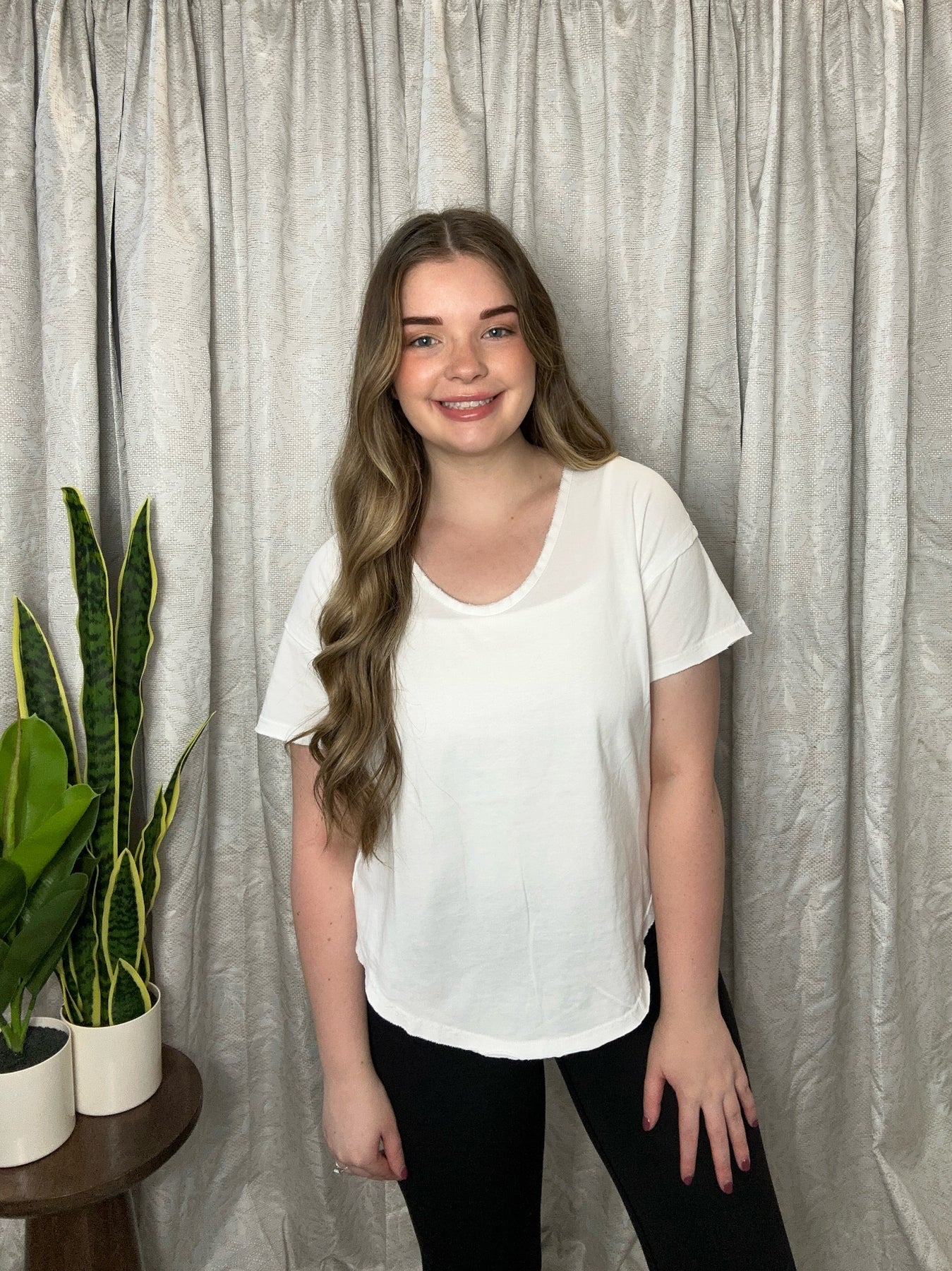 Young woman wearing white scoop neck short sleeve t-shirt with relaxed fit, styled with black pants against neutral curtain backdrop