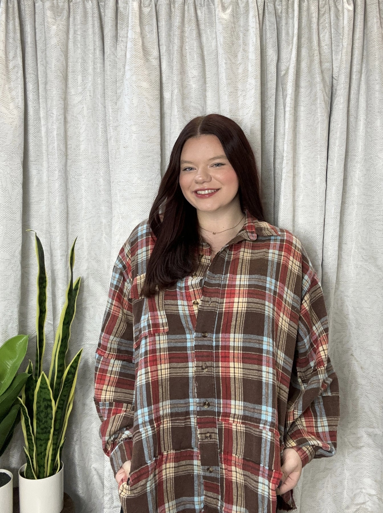 Wrap yourself in comfort with the Cindy Mocha Flannel, an oversized button-up designed for effortless style. Crafted in soft, breathable flannel, this piece features rich fall-inspired tones that transition seamlessly from season to season. The relaxed fit drapes beautifully, making it perfect for layering or wearing solo on crisp days. Whether you're settling in at home or heading out for casual adventures, this cozy essential delivers warmth and timeless appeal. A wardrobe staple that feels as good as it looks.