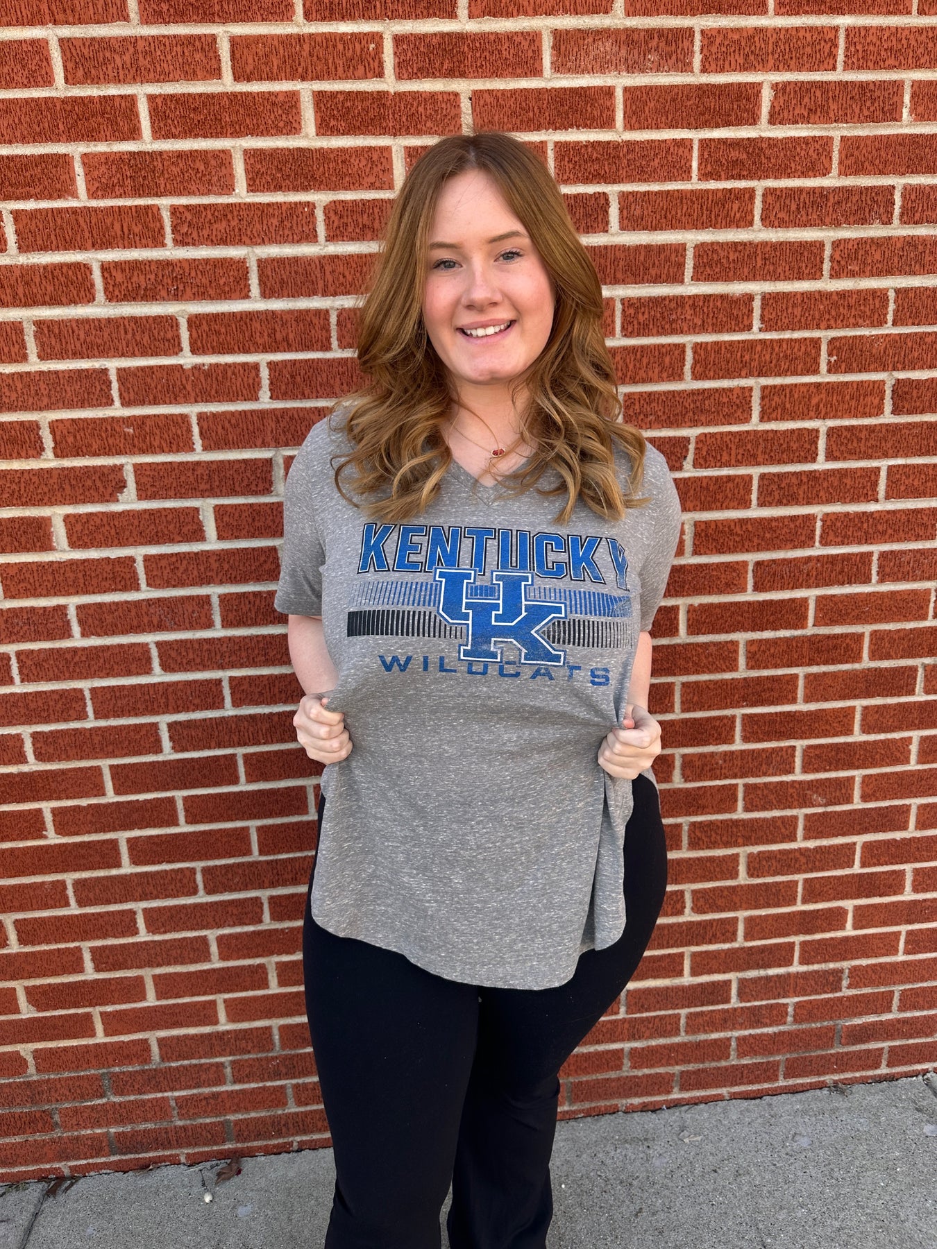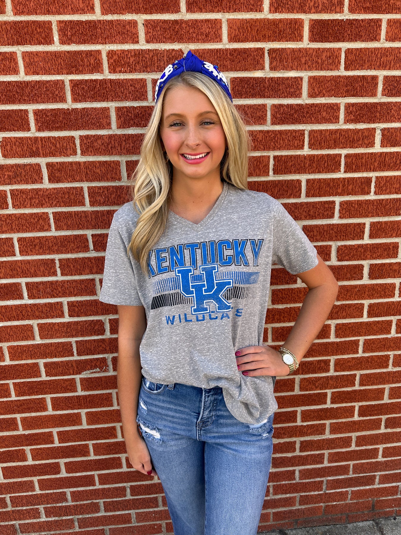 The Kentucky Harley V-Neck Tee is a must-have for any fashion-forward wardrobe. Made with soft, comfortable fabric, this tee features a stylish v-neck and classic short sleeves. Show off your love for Kentucky in a trendy grey design that is both casual and versatile.